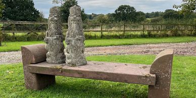 A stunning carved pink sandstone bench, likely to have originated from Cumbria as there is an abun of pink sandstone there. Breaks down into three pieces. £750.