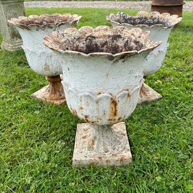 A stunning trio of genuine Georgian cast iron urns. Sadly some petal damage to all three. £650.