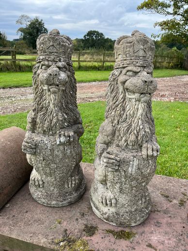 An unusual pair of rec stone lions with crowns and shields, they would look fabulous either side of an entrance. £225.